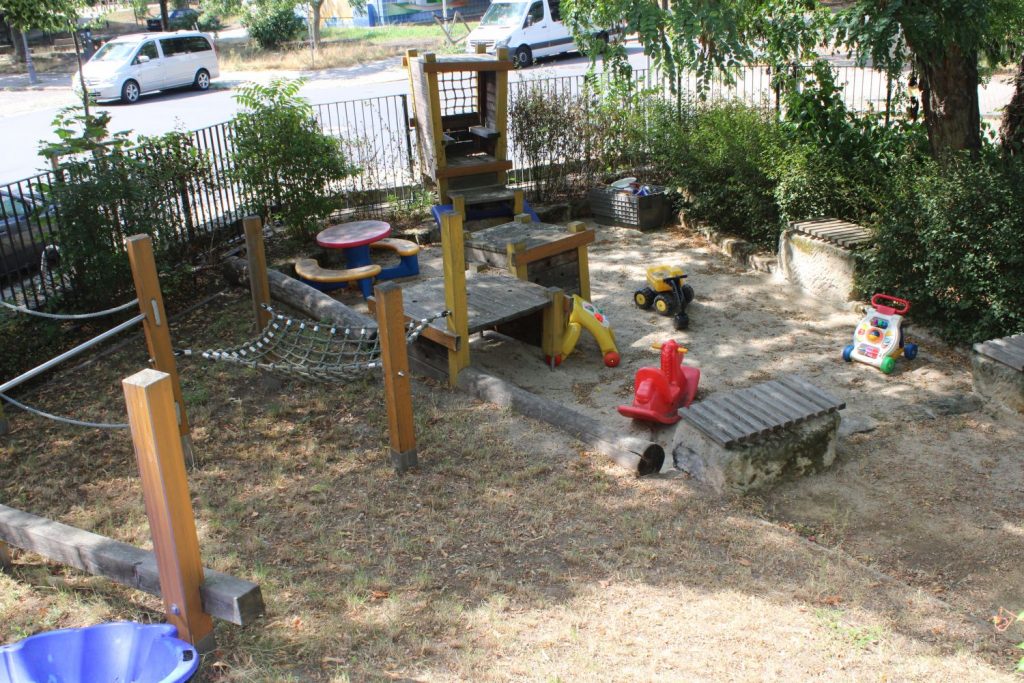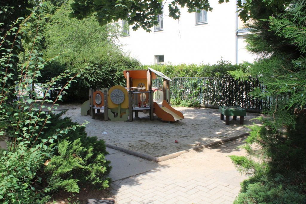 - Garten mit Rutsche, Sandkasten und Spielhäuschen